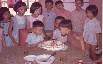 Mrs. Hiệp Thị H. Khương's children with their cousins during a 1966 birthday party. Front row: Quyền Hữu Khương, Định Thái Cao, Khương Trung Hồ. Back row: Phương Loan Thị Cao, Phương Mai Thị Cao, Ngọc Dung Thị Hồ, Tùng Thaí Cao, Can Trung Hồ, Sơn Thái Cao, and Quế Chi Tḥị Hồ