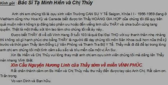 Mrs. Khương H. Thị Võ , married to Dr. Hoàng Gia Hợp, a national recognized medical doctor, Founding Director & CEO of Hùng Vương Hospital ̣(a nationally recognized hospital in South Việt Nam), Medical School Professor and member of the Board of Directors of Medical School, & Deputy Minister of Health. Dr. Hoàng Gia Hợp graduated from the First Class of Medical School of Hà Nôị during the French-Vietnam colonial era (his father Dr. Hoàng Gia Hội graduated from the First "Medecin School" in Hà Nội previously before a real medical institute was established by the French). They currently reside in Toronto, Canada and have 1 daughter Hoàng Thu Thủy. Mrs. Hoàng Thu Thủy is married to Dr. Tạ Minh Hiễn, a Medical Doctor - currently practices Anaesthesiology in Toronto, Canada. Click here for more detailed information about ==> Dr. Tạ Minh Hiển. They have 2 children: Tạ Hoàng Thu Trang and Tạ Minh Hiếu. Dr. Hoàng Gia Hợp is the son of Dr. Hoàng Gia Hội, a First Class of "Medicin" Graduate in Hà Nội. Dr. Hoàng Gia Hợp is also the First Class of "Medical Doctor" Graduate established in Viet Nam during the French Colonization. That was considered as the Greatest Achievement and Honor for a Vietnamese to be able to accomplish such highly prestigious education. Dr. Hoàng Gia Hợp held various high ranking cabinet positions in South Vietnam during the First and Second Republic of South Vietnam: including Deputy Minister of Health, Chairman of Medical School, Founder and Chief Executive Officer of Hùng Vương Hospital. Many successful Medical Doctors were students of Dr. Hoàng Gia Hợp and many of those MD diplomas have Dr. Hoàng Gia Hợp's signature. Now-a-day, ViệtNam is under a communist government but the hospital Hùng Vương still displays the original founding father Dr. Hoàng Gia Hợp name plate at the main entrance gate. With profound sadness for all Khương Hữu grand-family members, Dr. Hòang Gia Hợp has deceased on Feb 7th, 2009 at the age of 102 years old. |