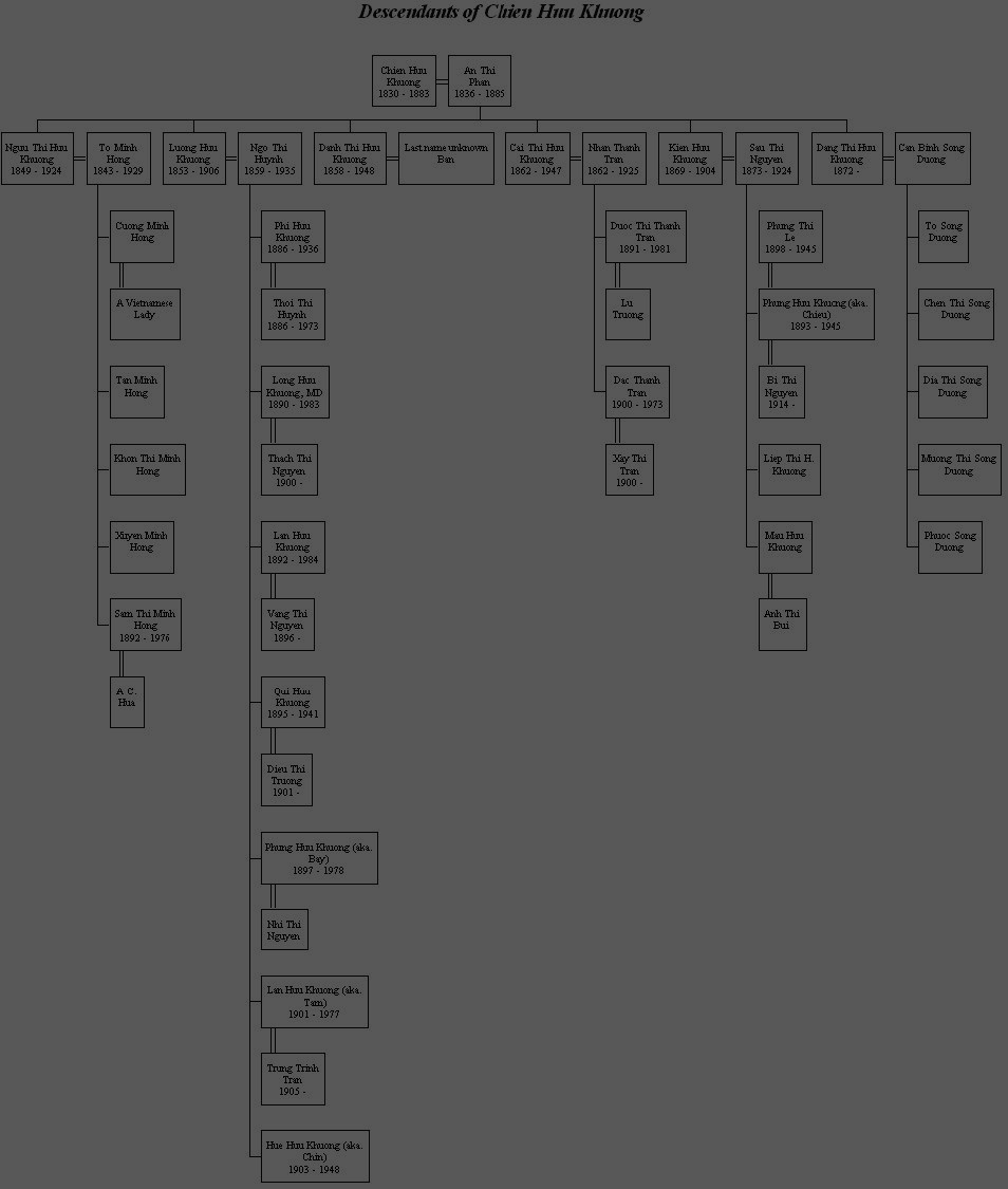 Mr. Khương Hữu Chiên (our Ancestor 1830-1883) was married to Mrs. Phan Thị An (1836-1885). Mr. Khương was a businessman entrepreneur of his own time. He expanded his commercial ship business along with acquiring massive rice farms. Mr. Khương became one of the largest rice farmers in Việt Nam. They have 6 children: 1. Khương Hữu Thị Ngưu (1849-1924) Click ==> ( Nguu_Thi_H_Khuong Page) 2. Khương Hữu Lương (1853-1906) Click ==> ( Luong_H_Khuong_And_Success_Vietnam Page). 3. Khương Hữu Thị Dành (1858-1948) Click ==> ( Danh_Thi_Huu_Khuong Page). 4. Khương Hữu Thị Cãi (1862-1946) Click ==> (Cai_Thi_Huu_Khuong Page). 5. Khương Hữu Kiễn (1869-1904) Click ==> ( Kien_Huu_Khuong Page). 6. Khương Hữu Thị Đặng (1872-????) Click ==> (Dang_Thi_Huu_Khuong Page).ương |