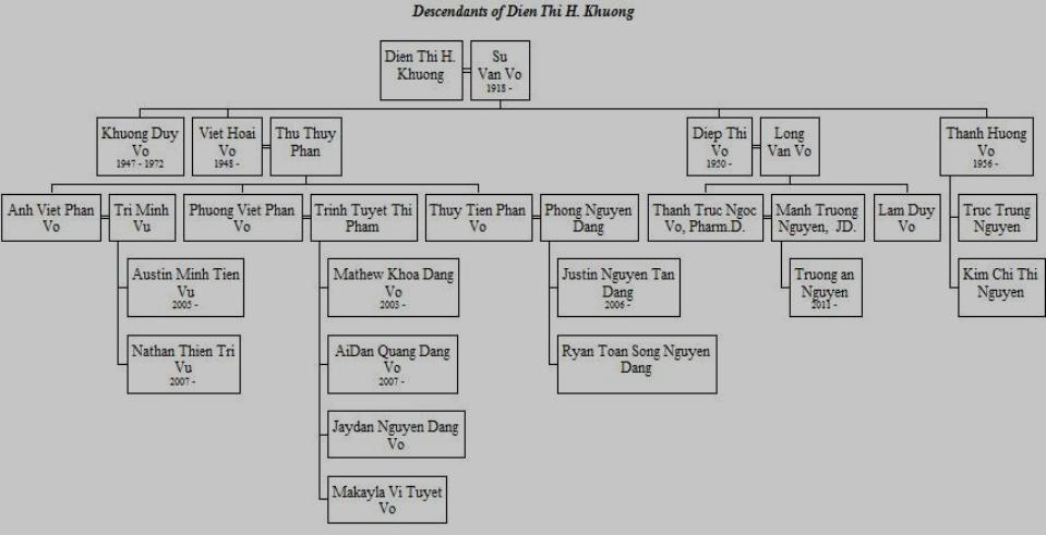Due to Mr. Khương Hữu Qui early decease (her father), Mrs. Khương H. Thị Điền, a devoted mother to her children and loving wife to her husband, acted as a parental-figure to continuously and persistently provide moral guidance and financial assistance to her siblings over many decades. Jointly with her husband, Mr. Võ Văn Sử, as business entrepreneurs, they acquired, managed, and expanded a printing-publishing corporation Mỹ Thành to become one of the largest printing business establishment in Vĩnh Long. It was also a "husband-wife team spirit" that contributed to their successful business expansion: a pharmacy named Đồng Tâm; later on became one of the most reputable pharmacy in their home town. They raised four successful children: 1. Air Force Captain Võ Duy Khương, a Vietnamese - US. trained Air force pilot, devoted his life to his country and passed away in air-combat (1972) - a national war hero. 2. Mr. Võ Hoài Việt, an Educator. He is married to Phan Thu Thủy. They have 3 children: Võ Phan Việt Anh, an US degreed Computer Programmer (she is married to Mr. Vũ Minh Trí, an US. degreed Electrical Engineer - they have 2 sons: Vũ Minh Tiến Austin & Vũ Thiên Trí Nathan), Mr. Võ Phan Việt Phương, an US. degreed International Business Analyst (his wife is Tuyết Trinh Thị Phạm-Võ; they have 3 sons and 1 daughter: Võ Đăng Khoa Matthew, Võ Đăng Quang Aidan, Võ Đăng Nguyên Jayden, and Võ Tuyết Vi Makayla ), and Mrs. Võ Phan Thủy Tiên, an US. degreed Accountant (she is married to Mr. Đặng Nguyên Phong, they have 2 sons: Đặng Nguyên Tân Justin, and Đặng Nguyên Song Toàn Ryan ). 3. Mrs. Võ Thị Điệp. She is married to a Lieutenant Võ Văn Long, a former Vietnamese Air Force Pilot. They have 2 children: Võ Ngọc Thanh Trúc, Pharm.D. (married to Attorney- at-Law Nguyễn Mạnh Trừơng, they have 1 son: Nguyễn Trường An), a successful Doctor of Pharmacy, and Võ Duy Lâm, a Pharmacy student. 4. Ms. Võ Thanh Hương, a "front-runner" HIPAA EDI Software Engineer (Health Insurance Portability and Accountability Act mandated by federal government in the effort of maximizing medical claims processing paper works for accuracy & efficiency) for a local/state government . She has 2 children: Nguyễn Trung Trực and Nguyễn Thị Kim Chi. |