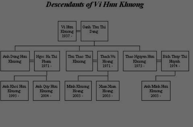 Mr. Khương Hữu Vi , a retired high ranking Army officer from the Vietnamese Army. He is married to Đặng Thị Thu Oanh. They have 3 children: Khương: H. Anh Dũng, H. Thu Thảo, H. Thảo Nguyên. 1. Mr. Khương Hữu Anh Dũng was raised by his aunt Mrs. Khương Thị Điền. He is married to Phạm Thị Ngọc Hà, they have two children: Khương Hữu Anh Khôi and Khương Hữu Anh Quy. 2. Mrs. Khương Thị Thu Thảo is married to Mr. Hoàng Vũ Thạch. They have two children: Hoàng Khương Minh and Hòang Xuân Xuân. 3. Mr. Khương Hữu Thảo Nguyên a University degreed in Japanese.Mr. Khương works for an International Travel Agency and is responsible for all travel arrangements foreign visitors from Japan, Europe, and the USA. Heis also a business entrepreneur. He is married to Huỳnh Thị Bích Thủy. They have one son: Khương Hữu Anh Minh. |