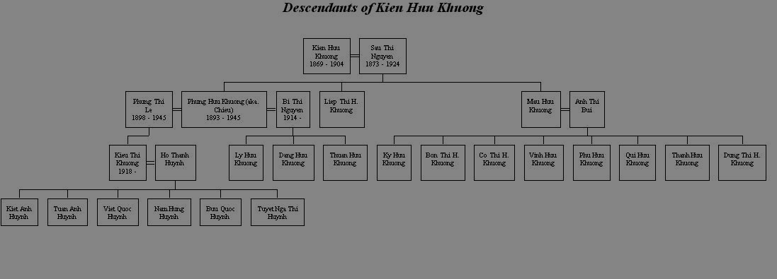 | Mr. Khương Hữu Kiễn (1869-1904) was married to Nguyễn Thị Sáu (1873-1924). They have 4 children: 1. Khương Hữu Phụng (aka. Chiếu). He was born in 1898. He was married to Lê Thị̣ Phụng (1898-1945). They have 1 daughter Khương Thị Kiều. Khương Thị Kiều (1918) is married to Huỳnh Thanh Hổ. They have 6 children: Huỳnh Anh Kiệt (died at 6 years of age), Huỳnh Anh Tuấn, Huỳnh Quốc Việt, Huỳnh Hùng Nam, Huỳnh Quốc Bữu, Huỳnh Thị Tuyết Nga. Khương Hữu Phụng second marriage to Nguyễn Thị Bi ̣(sanh năm 1914). They have 3 sons: Khương Hữu Lý, Khương Hữu Đáng, Khương Hữu Thuận. 2. Khương Hữu Thị Liếp (died young). 3. Khương Hữu Mậu. He is married to Bùi Thị Anh. They have 8 children: Khương Hữu Thị Ký, Khương Hữu Thị Bổn, Khương Hữu Thị Cơ, Khương Hữu Vinh, Khương Hữu Phú, Khương Hữu Quí, Khương Hữu Thành, Khương Hữu Thị Dung (former husband is Vietnamese Singer Joe Marcel). |