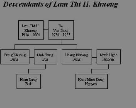 Mrs. Khương Hữu Thị Lắm. She is married to Mr. Đặng Văn Bé (Newspaper Executive Publisher & Owner). They have 2 girls: Đặng: Khương Trang, Khương Hoàng. During her retirement age, Mrs. Lắm Thị H. Khuong practiced Buddishm meditation and vegetarian dietary. Mrs. Lắm Thị H. Khương just passed away in December 25th of 2004 shortly after visiting Việt Nam. 1. Mrs. Đặng Khương Trang is married to to Mr. Linh Tùng Bùi, a Psychology major. They have one son: Bùi Đặng Huân. 2. Mrs. Đặng Khương Hoàng is married to Mr. Minh Ngọc Nguyễn. They have one son: Nguyễn Đặng Minh Khôi. |