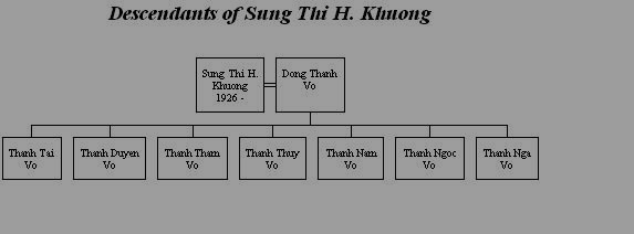 | Sứng Thi H. Khương. She is married to Mr. Vỏ Thành Đông (a very successful Businessman & Plantation Owner). They have 2 boys and 5 girls: 1. Võ Thị Thành Tài, she is married to .... 2. Võ Thị Thành Duyên, she is married to ... 3. Võ Thị Thành Thấm, she is married to ... 4. Võ Thị Thành Thuý, she is married to .... 5. Võ Thành Nam, he is married to .... 6. Võ Thị Thành Ngọc, she is married to ... 7. Võ Thành Ngà, he is married to .... |